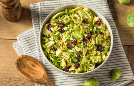 For an older child, it could be a great opportunity to teach them the bridge grip for some essential knife skills. Show them how to take a whole sprout, peel the outer leaves off, then slice carefully through the middle. You could leave them halved and roast or fry in a little oil and salt, or a confident chopper could help you slice them finely to “shred” and eat raw in a slaw or fried with some butter and grated cheese!