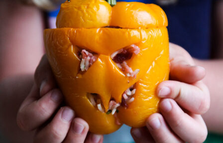 Grab a couple of different coloured peppers and explore what they look like together – what do they remind you of? Encourage imagination, allowing them to explore with their senses, perhaps shaking, tearing, or sniffing it. Try cutting one lengthways and see what they think it looks like now – do they see a scary face or something else? Let them be curious and come up with mad ideas to keep it fun!