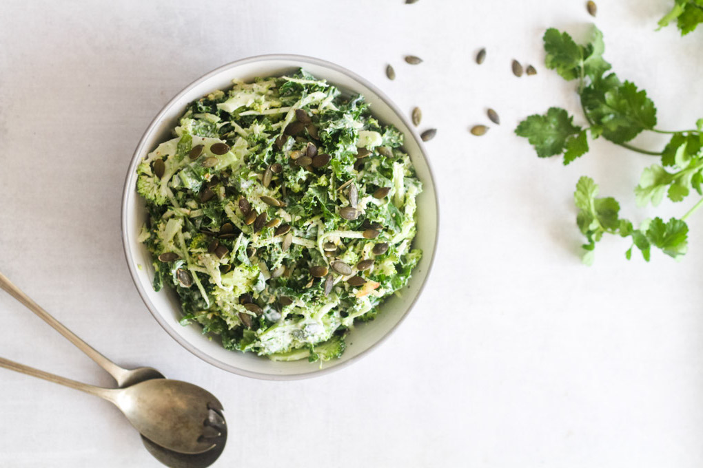 First, prep the broccoli by separating the stalk and florets. Finely sliced the florets with a sharp knife or using the slicer in your food processor. Grate the stalks with a box grater or the food processor’s grater. Mix in a bowl with the kale and carrot or apple. Add the mayo, lime zest and juice and fresh herbs. Mix well and taste. Season as needed, then sprinkle over the seeds or cranberries.