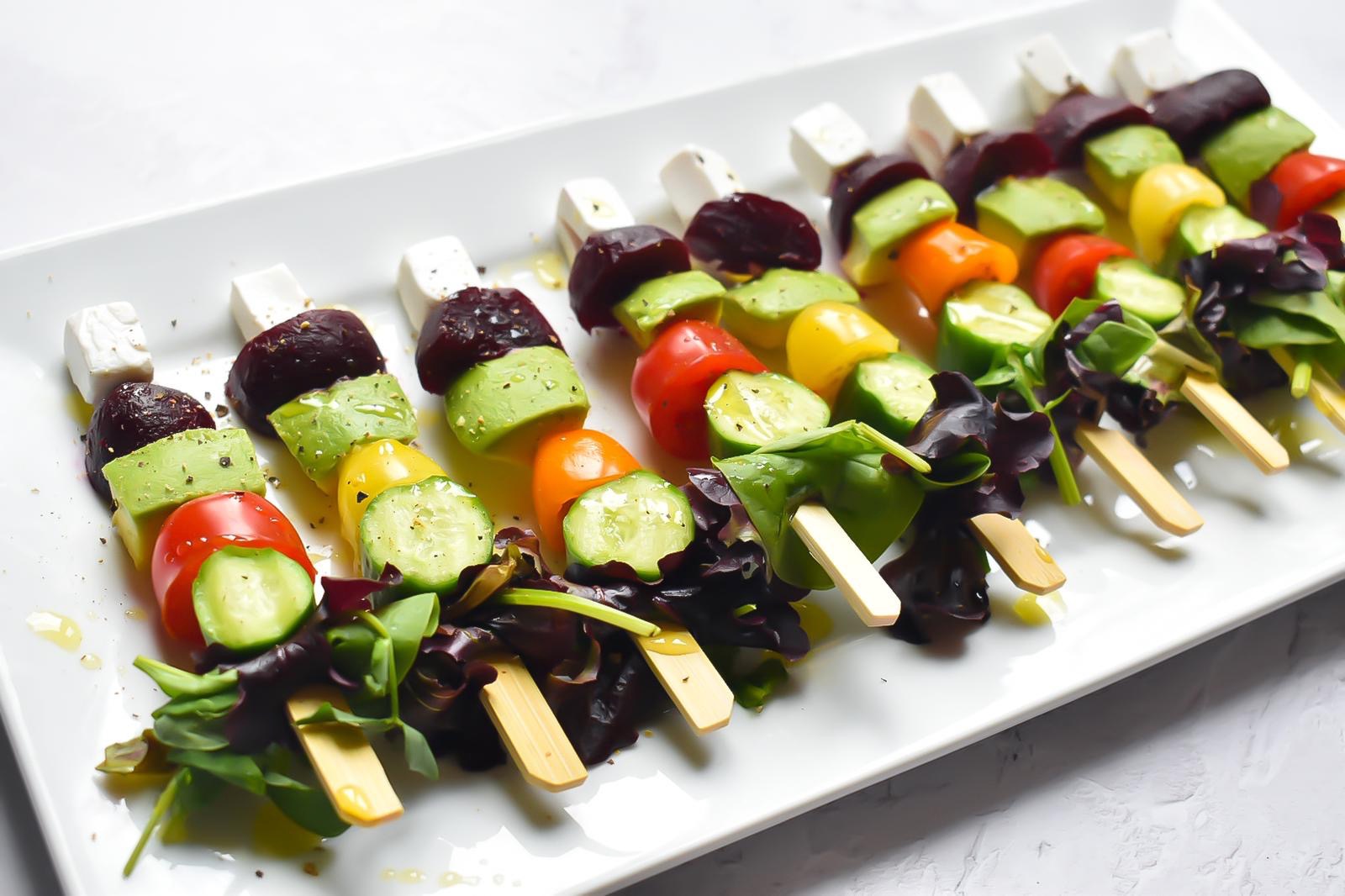 Then thread a piece of the cucumber, tomato, and avocado, leaving room for the beetroot and cheese.