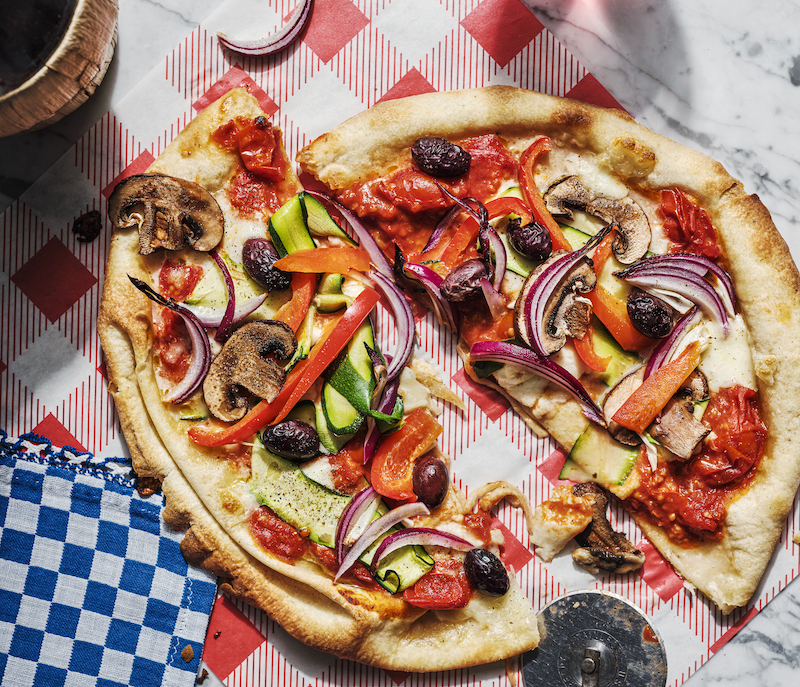 Kids can really own this recipe: making the dough by themselves with pre-measured out ingredients, rolling it out, squashing the warmed tomatoes for the sauce and spreading it on the dough. And, of course, topping it with as many veg as possible! Make it a competition to see who can use the most veg, or let them choose their own from a selection of healthy, vegetable-packed toppings.