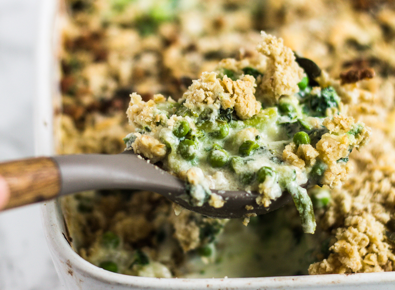 A creamy, cheesy, filling dinner packed with green vegetables, covered in a lighter-than-usual white sauce, and topped with a wholegrain crumble. Nutrient dense, rich, filling and balanced. Full of green vegetables you don’t even notice yourself eating!