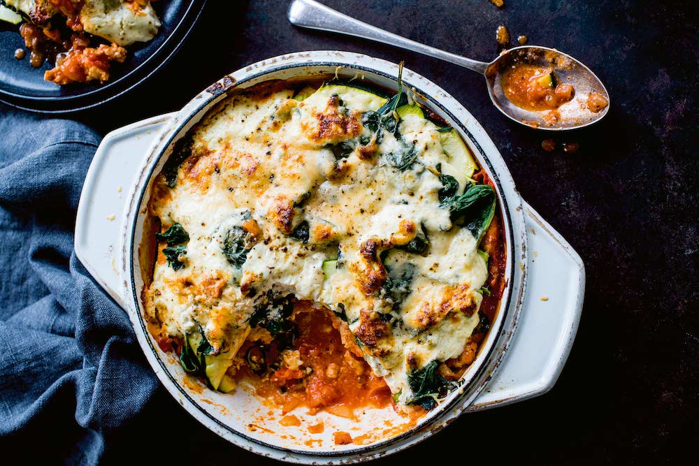 This easy low-carb ‘lasagne’ was created during a brilliant Zoom session when we had to come up with a dish using specific ingredients. These included sausages, tinned tomatoes and spinach. We skipped the starchy lasagne sheets and used layers of courgette instead.