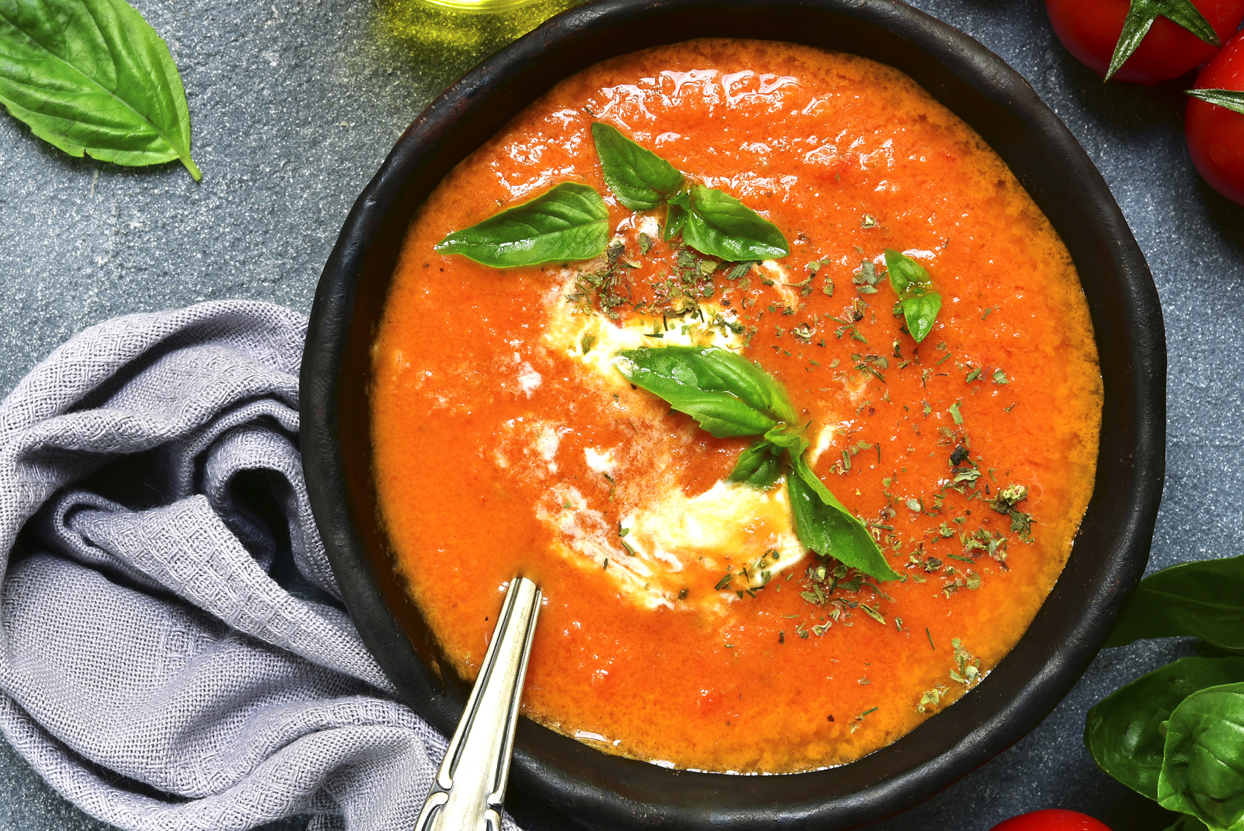 Allow to cool slightly, then blitz until smooth and serve with the basil and cream if using. Perfect with cheese toasties (cut into strips for egg-and-soldier-like dipping for kids).