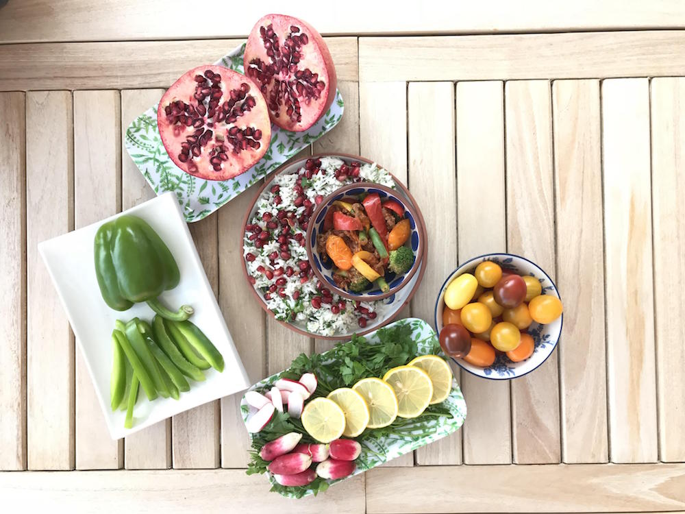 Kids can help by creating the carrot ribbons, grating the beetroot and garlic, breaking off the broccoli florets, and measuring out the herbs, spices and tomato puree.  They can also stir the pomegranate seeds, parsley, and lemon rind into the rice.