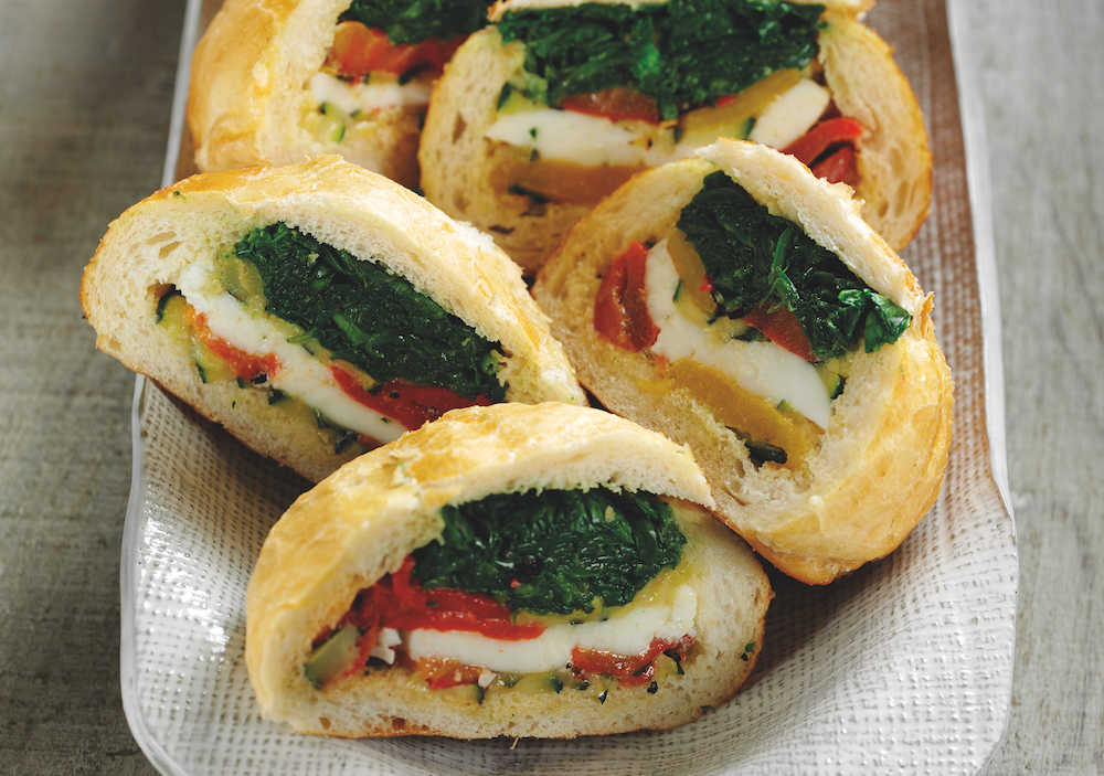 Drain the peppers reserving the oil. Heat 1 tbsp of the oil and fry the courgettes for 2-3 minutes until softened and mix in the peppers and basil, season. Place half the courgette mixture in the base of the rolls, add the mozzarella and then the remaining courgette mixture, press in the spinach then top with the roll lid.