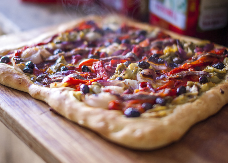 Toss the vegetables to cover them with oil and then lay them attractively on top of the dough. Top with the anchovies and olives. Place in the oven for 25-30 minutes until the crust is crisp and browned.