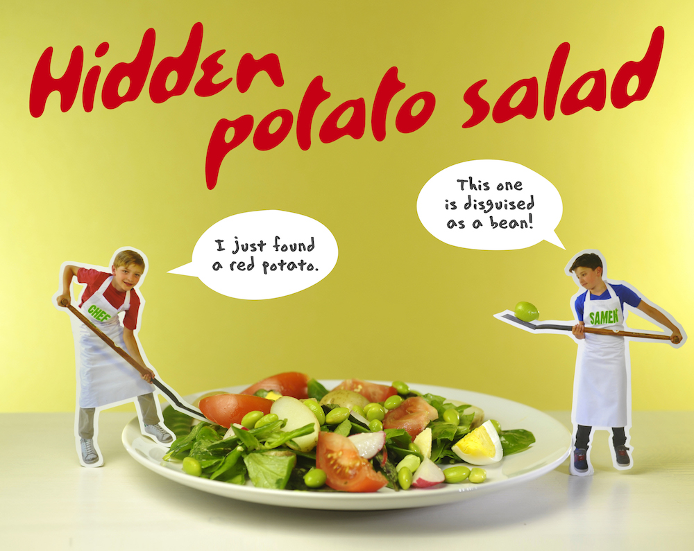 Cut the tomatoes into wedges and do the same with the eggs. Layer up the tomatoes and eggs in the salad bowl. Then throw in the cooked potatoes – and hide them a bit under the rest of all the greens, since it’s a hidden potato salad. You know, since officially they’re not veggies we had to sneak them in!