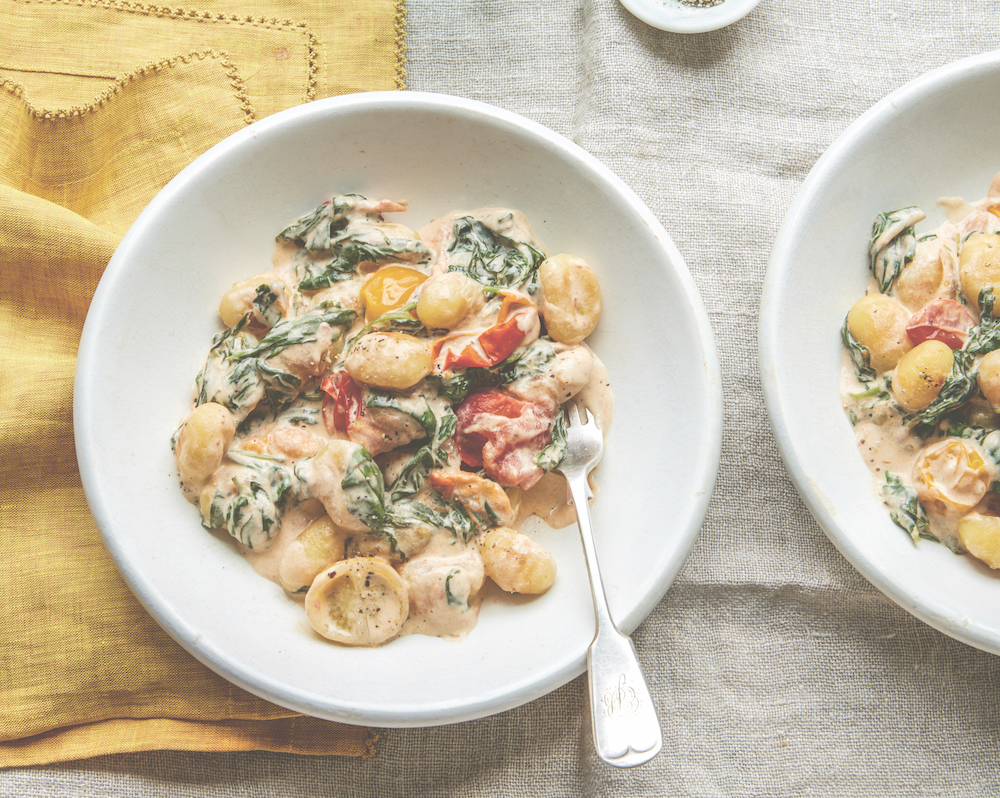You need the gnocchi and fresh tomatoes for this recipe, but you could use garlic purée instead of fresh, kale to replace the spinach and soured cream instead of crème fraîche.