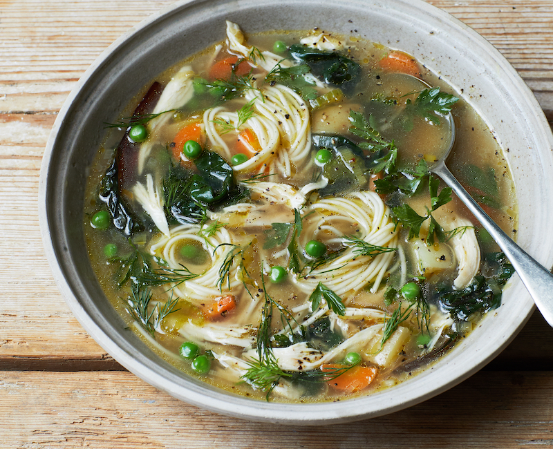 There’s nothing quite like a warming bowl of homemade soup to make you feel a thousand times better. If I’ve had a Sunday roast chicken, I make this on a Monday to get a great boost of vegetables in. It’s based on store cupboard and freezer ingredients like frozen peas, onion, garlic and carrots, though you could swap in anything that needs using up. You can up the amount of vegetables or noodles here, so adjust to your liking. Post-Christmas and other celebrations, this is a fantastic way to use up leftover turkey or any other leftover meats.