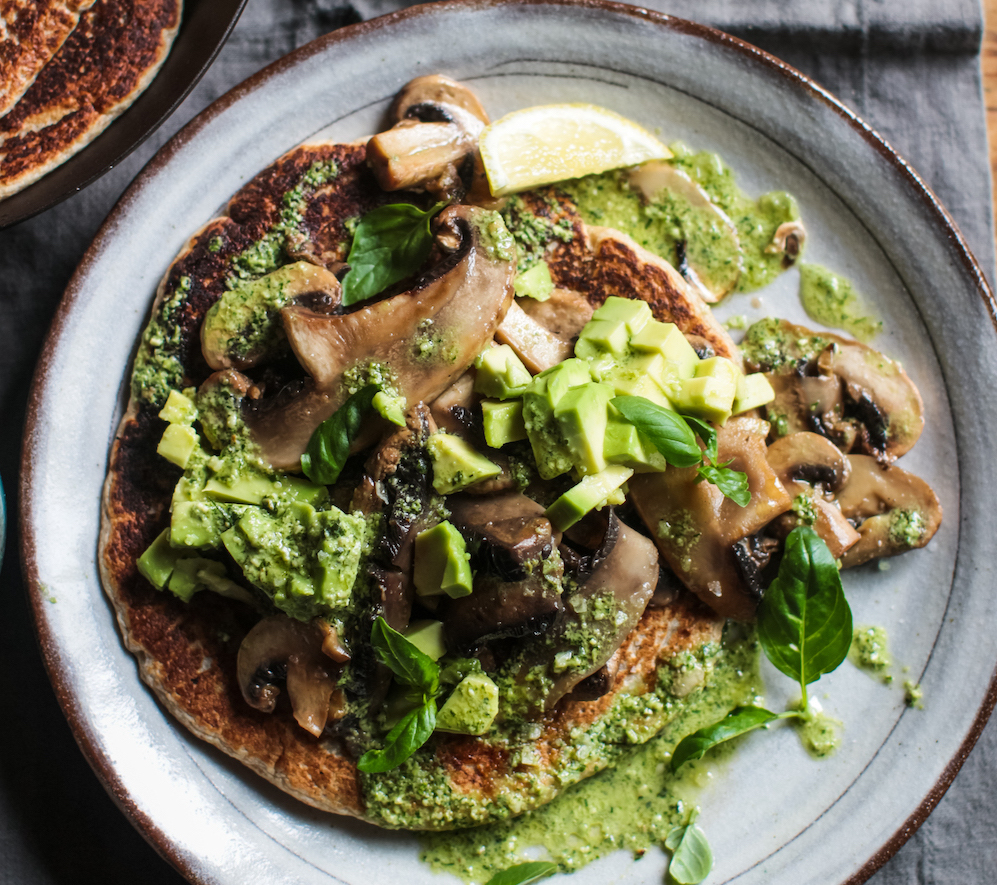 Top the oaty pancakes with the mushrooms, avocado and pesto.
