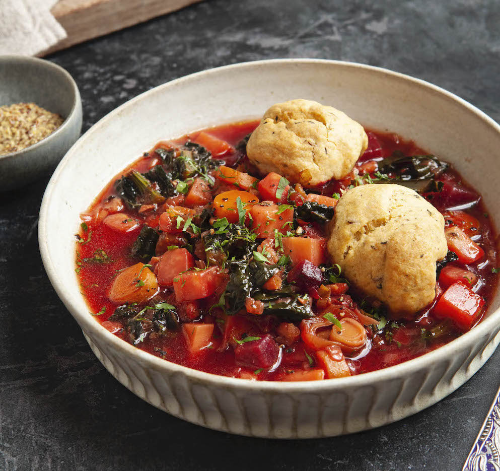 Stir the grated beetroot into the soup. Drop the dumplings on top of the soup and either put the pan in the oven for about 15 minutes until the dumplings are puffed up and lightly browned, or cover and leave to simmer on the hob for 15–20 minutes. Garnish with dill or parsley and serve with dollops of mustard or horseradish.
