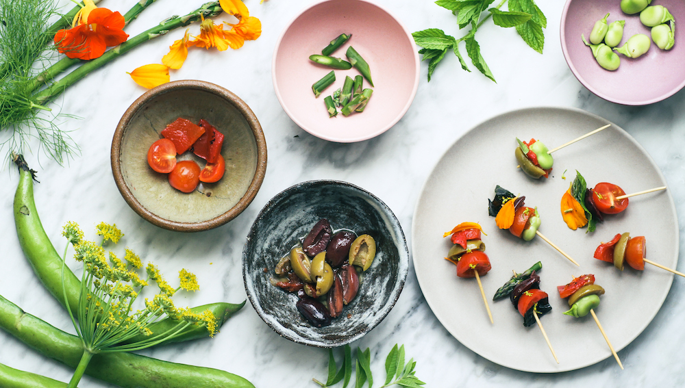 This dish is inspired by a Basque Pintxos recipe called Gilda. A Gilda usually consists of an olive, anchovy and pepper skewered onto a toothpick. My daughter loves olives so I thought this might be a fun way to deliver them along with some other vegetables. Salad on a stick is a fun way to enjoy vegetables as canapés or with kids. I made these with my daughter and allowed her to choose which ingredients were put onto each skewer. Choose a few ingredients you know your children will like and mix them up with a few new ingredients incase they are feeling adventurous and want to try something they aren’t used to eating.