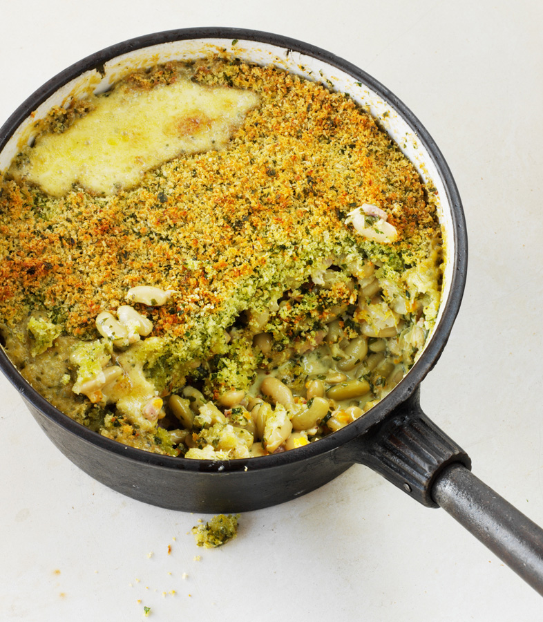 For the parsley crumb: place the crumbs into a kitchen blender with the lemon zest, garlic, parsley, salt and pepper and then blitz until coarsely chopped – this will be no more than 20-30 seconds. Place into a bowl and add the remaining Parmesan and gruyere cheese then sprinkle on the parsley crumb and bake in the oven at 200C for 15 minutes.