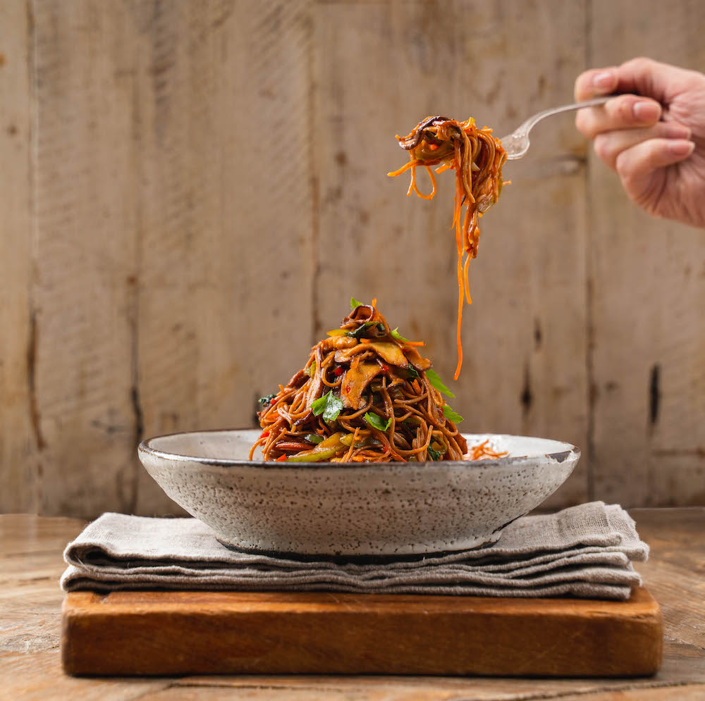 Cook the hard veg first, such as the carrots, sweet potato and green pepper for 45 seconds. Add the chopped chili, ginger, shallot, spring onion, shredded pork and cook for another minute. Season lightly, then add the lime juice, zest, soy sauce, the cooked noodles and then serve into the bowls.