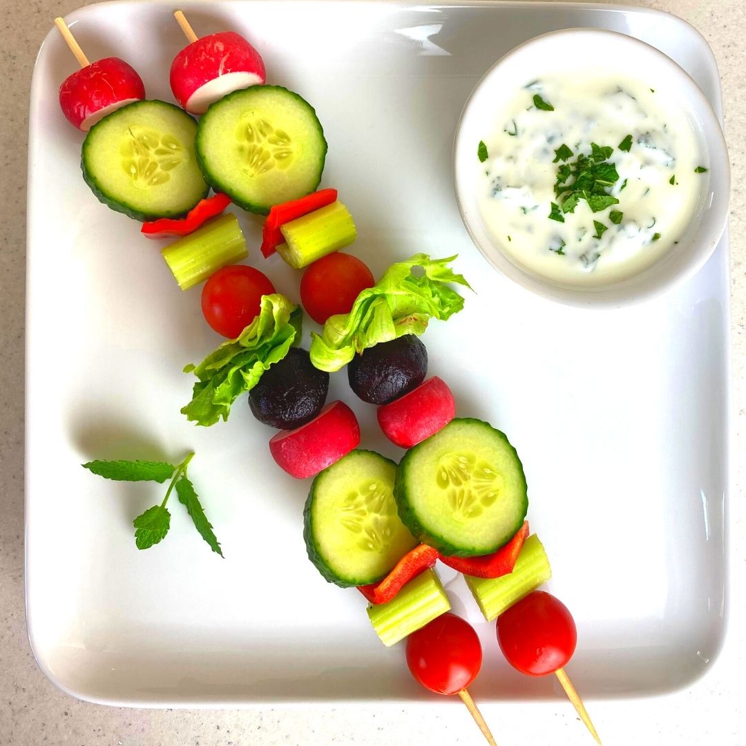 Kids can really take charge here, which is part of why salad sticks are so popular with them! Make sure to prep any chopped ingredients for them, and keep an eye on their fingers around the sharp end of the skewer, but otherwise let them build it themselves. Help them with any harder ingredients, and let them make the dip.